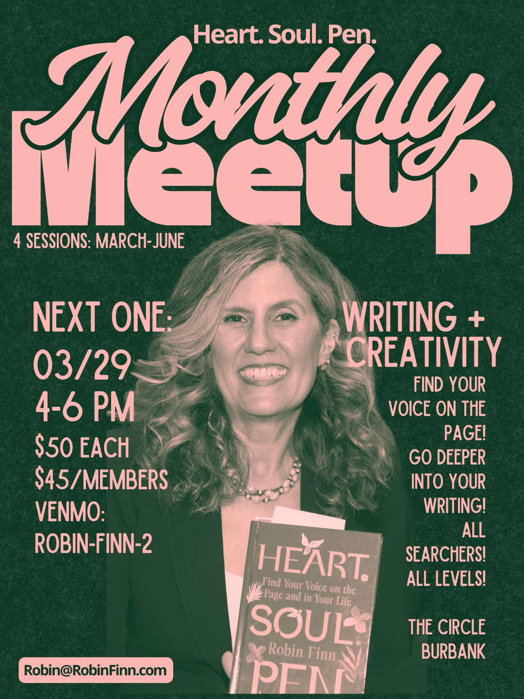 All writers, all genres, all levels are welcome in the Heart. Soul. Pen. Monthly MeetUp. Whether you are developing a writing project, book, or screenplay, or simply want to go deeper into your creative self-expression, the Monthly MeetUp invites you to connect to your voice, strengthen your practice, get an accountability check, and be a part of a nurturing writing community. Facilitated by Robin Finn.
